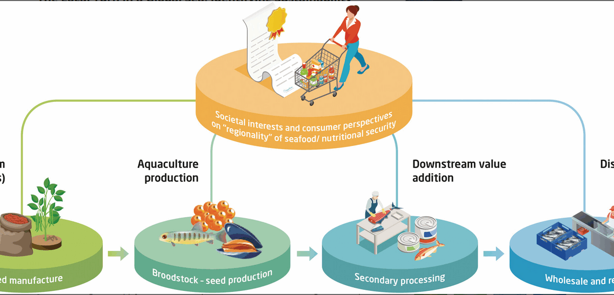 Marine aquaculture, like the broader seafood industry, relies heavily on international trade and global supply chains for both production and sales. Recent global disruptions, including the COVID-19 pandemic, the Russian invasion of Ukraine, the conflicts in the Middle East, and trade tensions, have exposed the social and economic vulnerabilities inherent in a globalized production system. In response, these events have sparked growing interest in transitioning to localized and regional supply chain models. Calls to “buy national” and support domestic economies highlight this trend toward regionalization. This study explores the sustainability implications of regionalizing marine aquaculture by examining the four key segments of the supply chain. These are (1) upstream inputs and resources (2) aquaculture production (3) downstream added value-processing and (4) distribution–transportation. Potential benefits of regional production models include increased resilience to disruptions, lower transportation-related carbon emissions, and support for local economies. However, such models may also introduce trade-offs, including reduced production efficiency, supply and sales limitations, and implications for social, cultural, and governance structures. Our analysis reveals that the sustainability outcomes of regionalization are complex and context-dependent. It is influenced by the specific characteristics of existing supply chains and the regional contexts in which they operate. While regionalization may offer advantages in certain contexts, it does not guarantee improved sustainability. Thus, it is crucial to critically assess the assumption that regionalization inherently leads to improved sustainability outcomes. Proactive evaluation of these dynamics is essential to develop strategies that maximize benefits while addressing potential trade-offs.